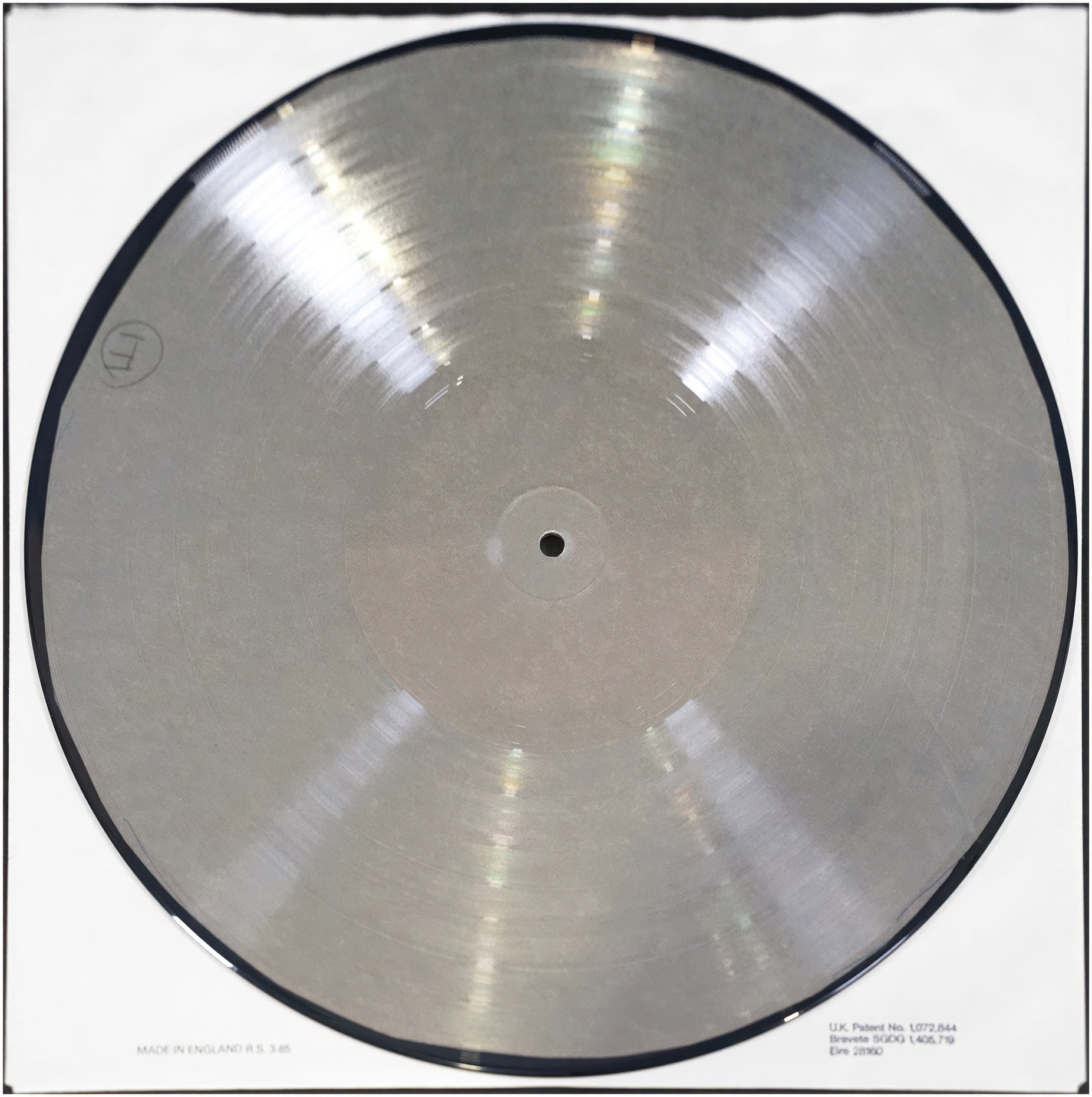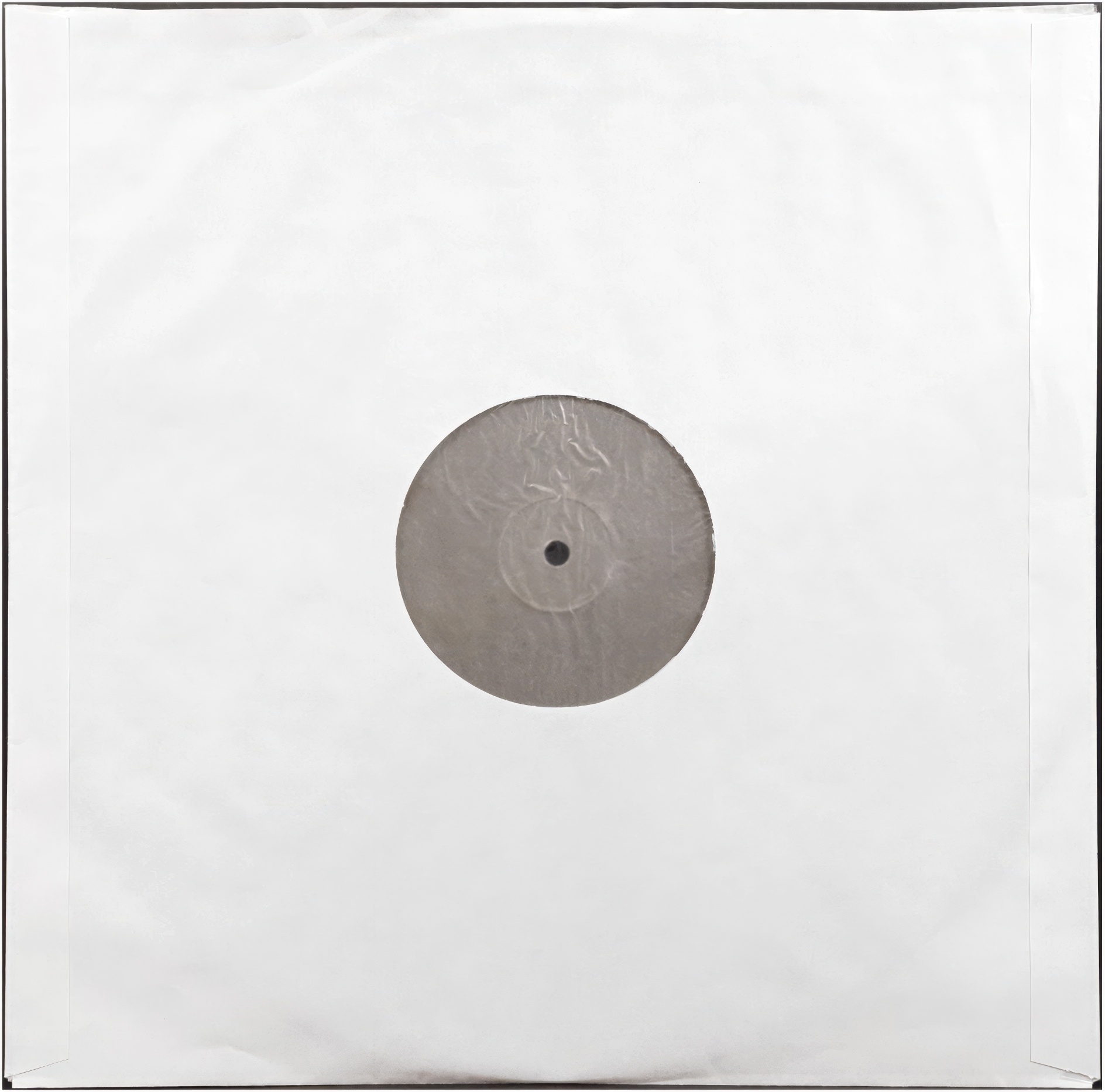 Test pressing picture disc release in paper window sleeve, featuring plain unprinted backgrounds where the final images and content would be.